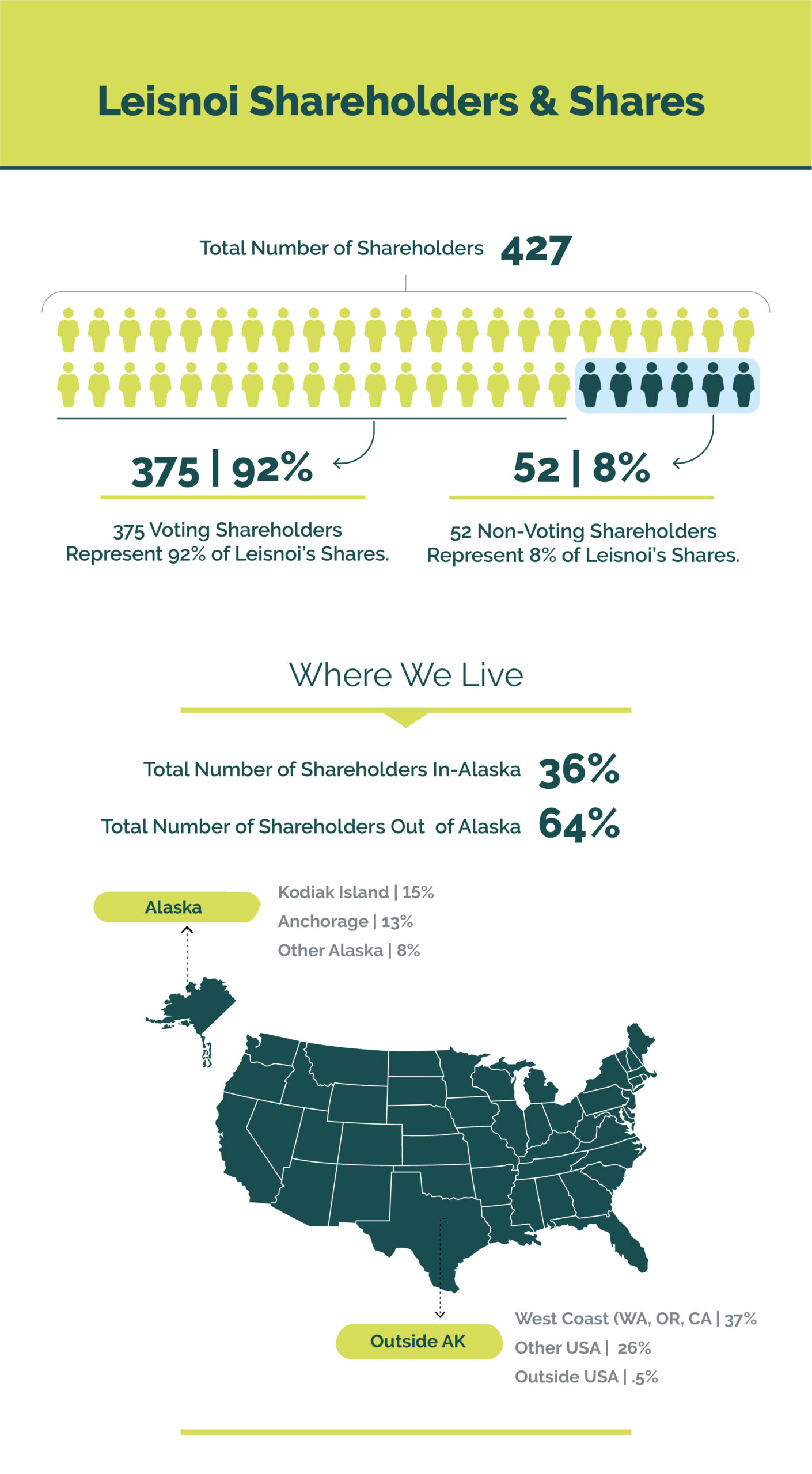 The data below is a snapshot of Leisnoi’s Shareholder demographics. As the number of Shareholders has grown, they have expanded beyond Kodiak and Alaska – and we now have Shareholders throughout the United States. Additionally, as original Shareholders have willed or gifted shares, their distribution is seen across a wide range of age groups. As our owner base evolves, it’s important to ensure there is adequate representation for all Shareholders. Adding two new directors opens up the opportunity for more Shareholders to be involved in their corporation.